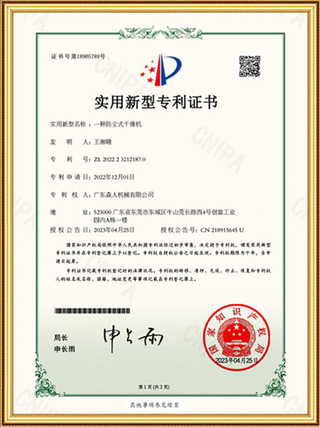 A dustproof dryer certificate